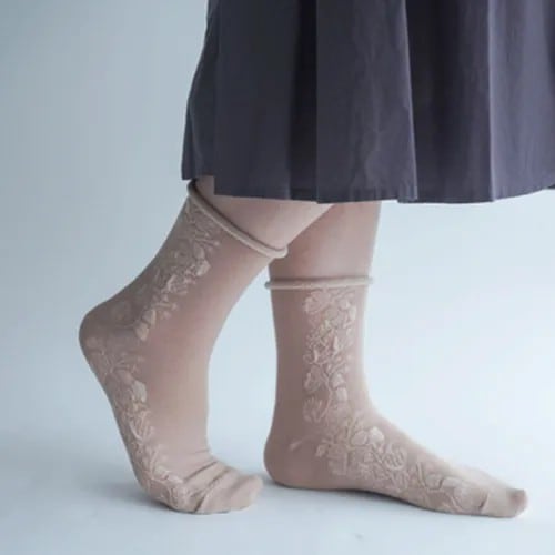商品名:レディース ライン 花柄 ソックス ナチュラル柄 てかがり クルー 靴下