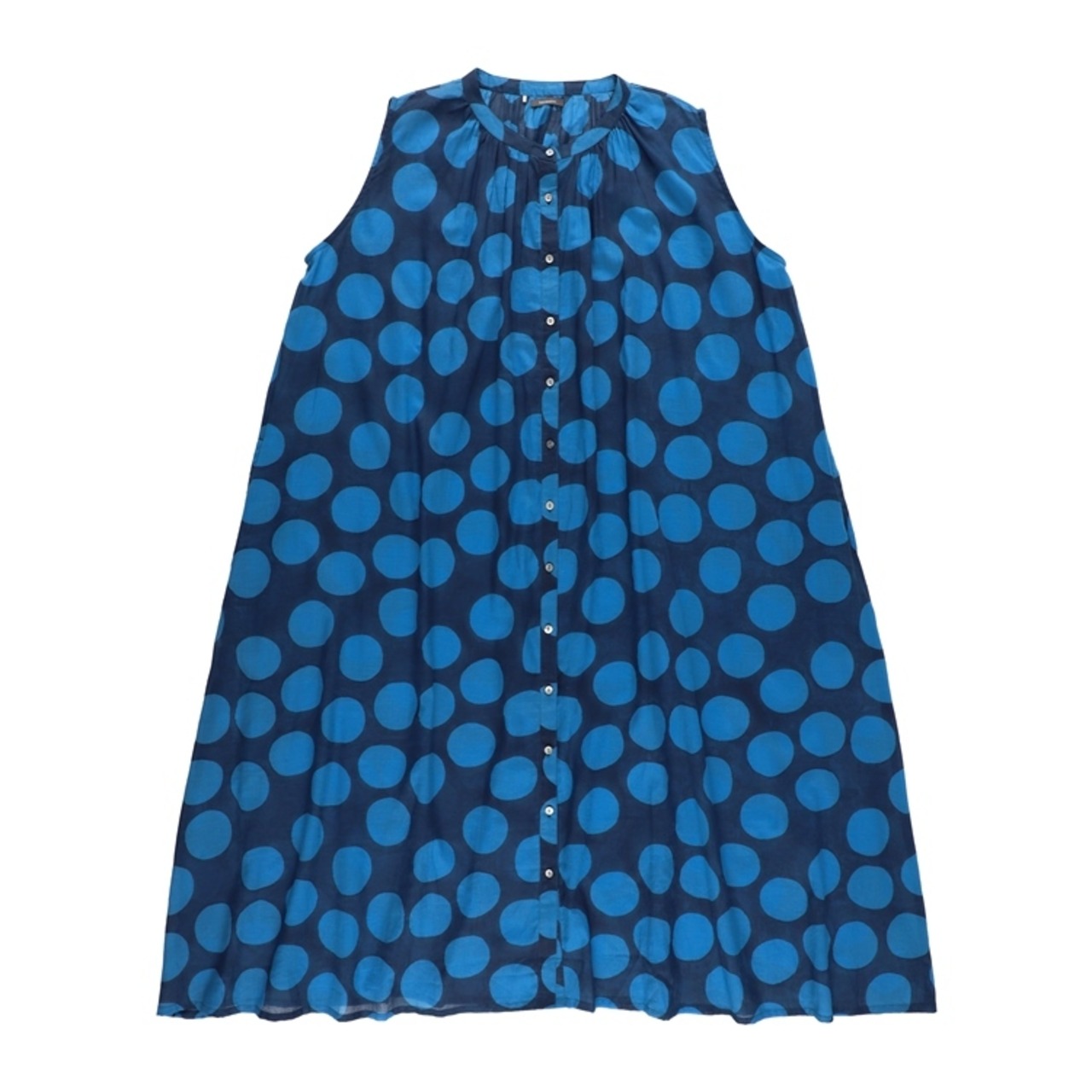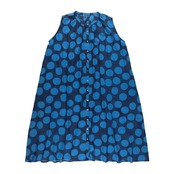 コットンボイル生地に、ブロックプリントで大胆なドット柄をあしらったノースリーブワンピース。