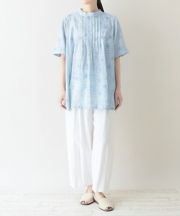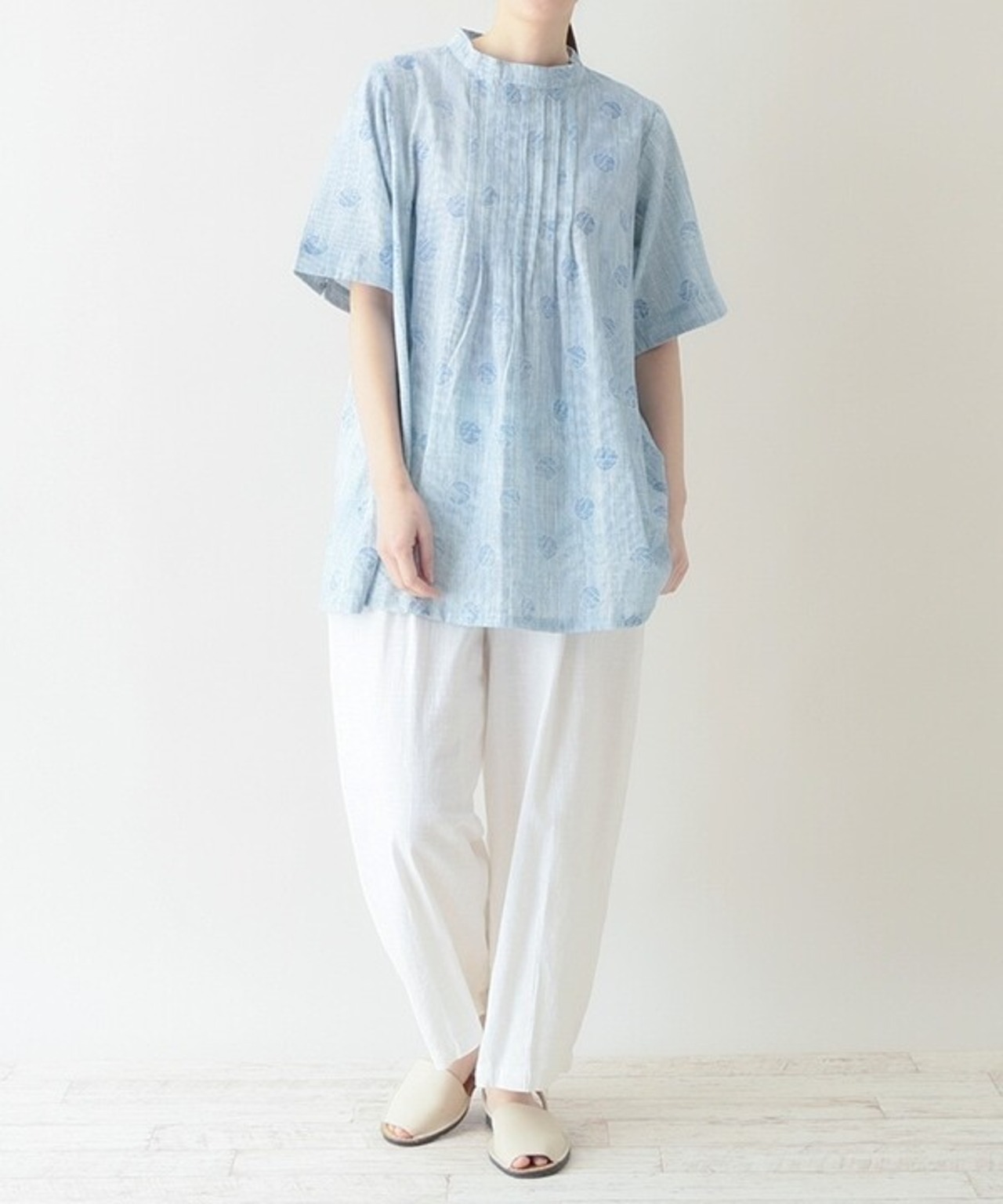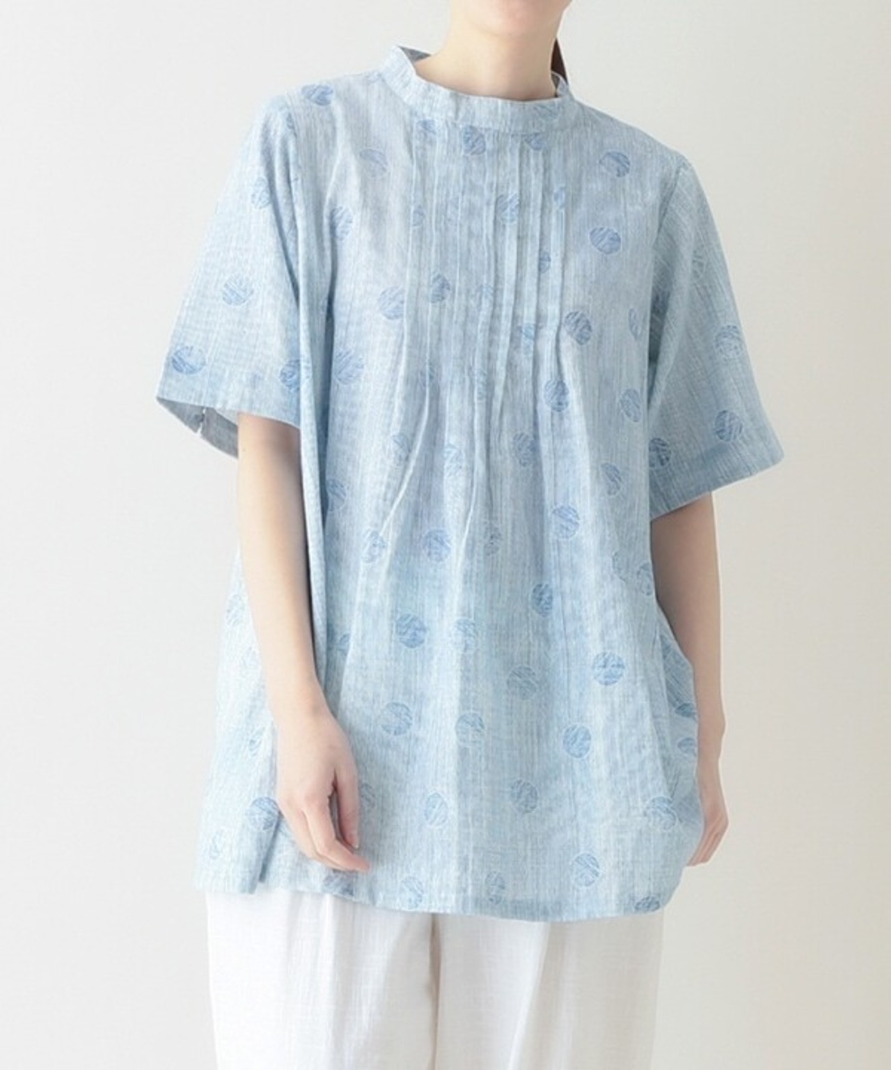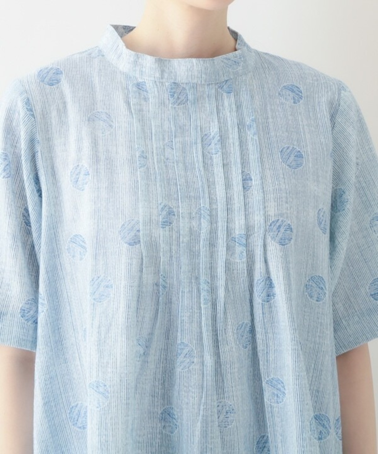 向きの違う線が織りなすドット柄が、オーガニックコットンの生地に絶妙にマッチしたチュニックブラウス。