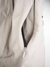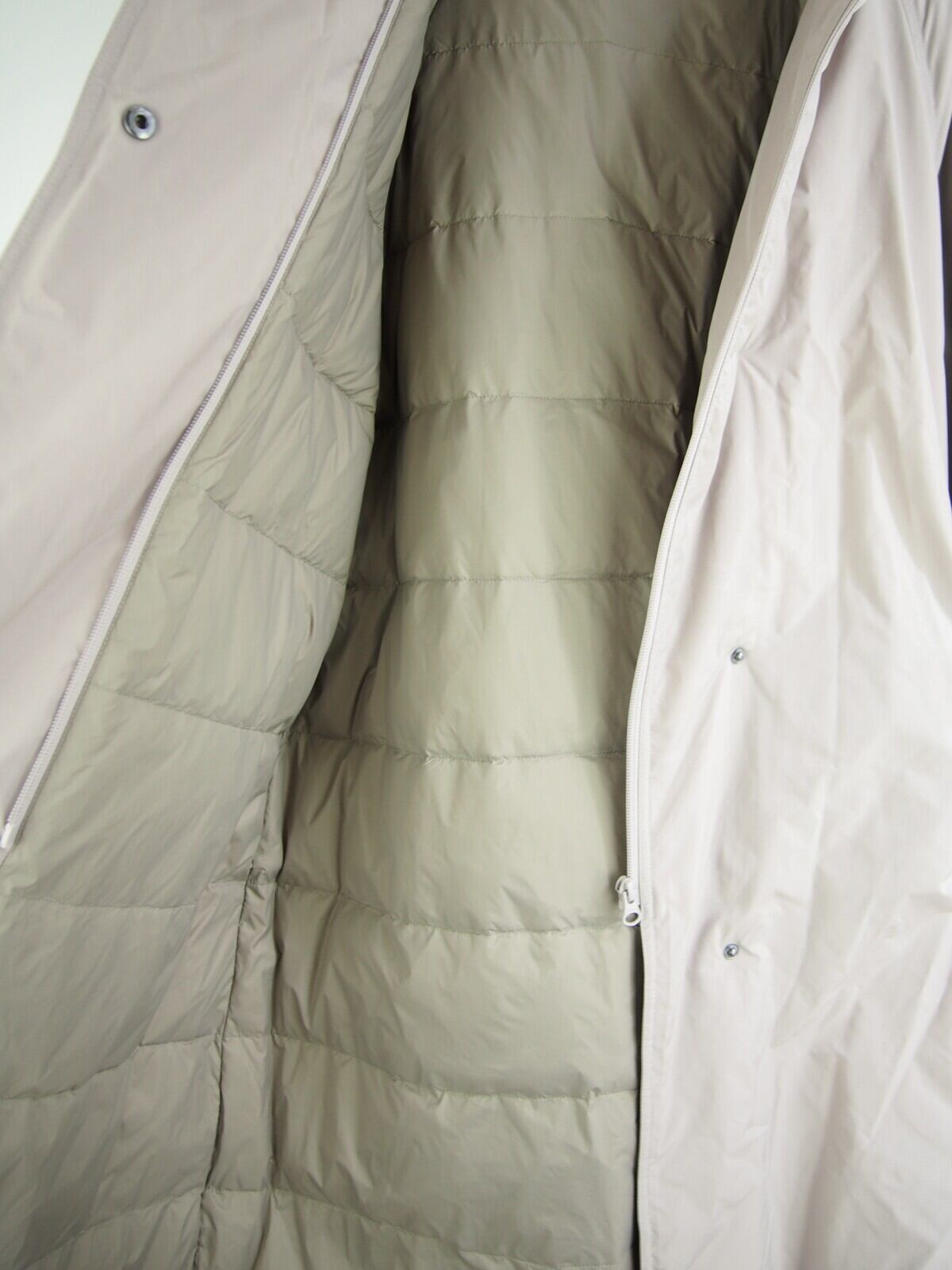 メモリータフタの特徴でもあるナチュラルな表面感と、光に反射するスモーキーな光沢が上品な印象のアウトシェルに、ダウンフェザー80%/20%を充填した軽量ロングコート。