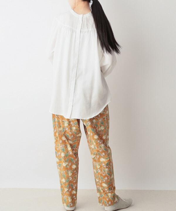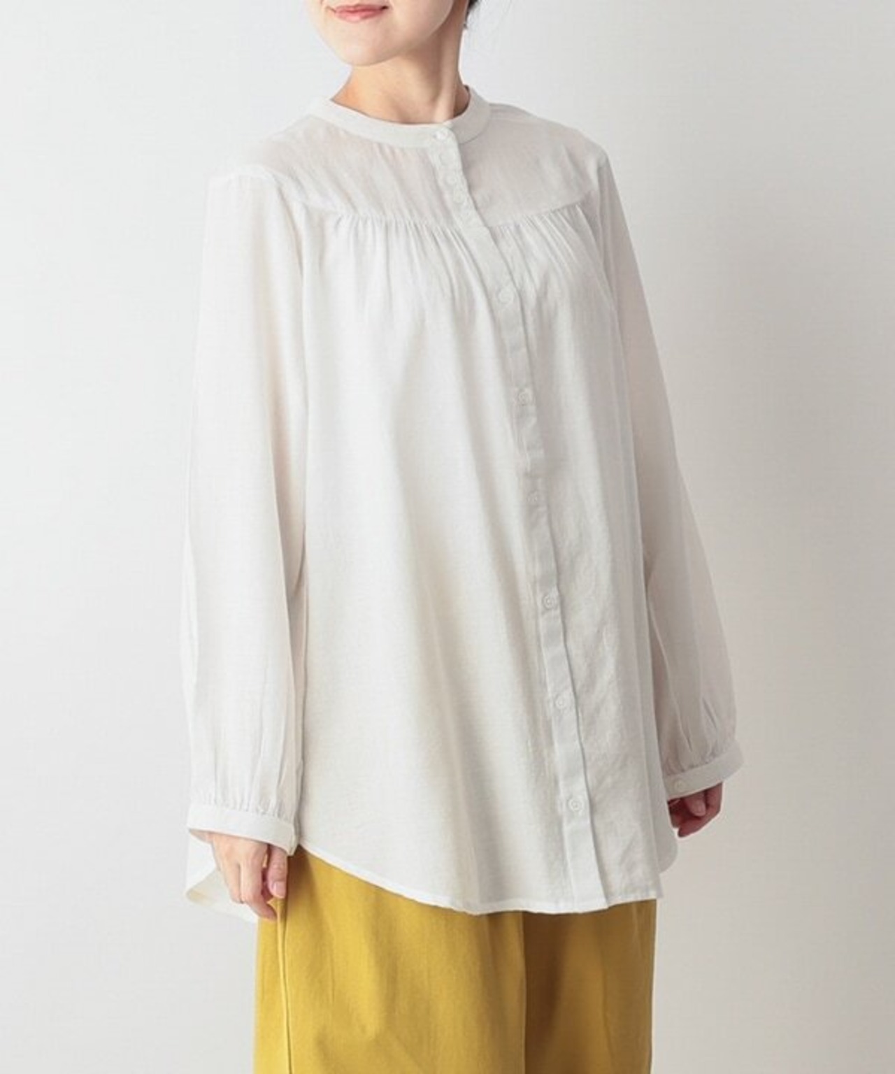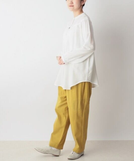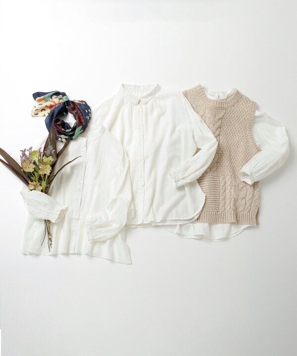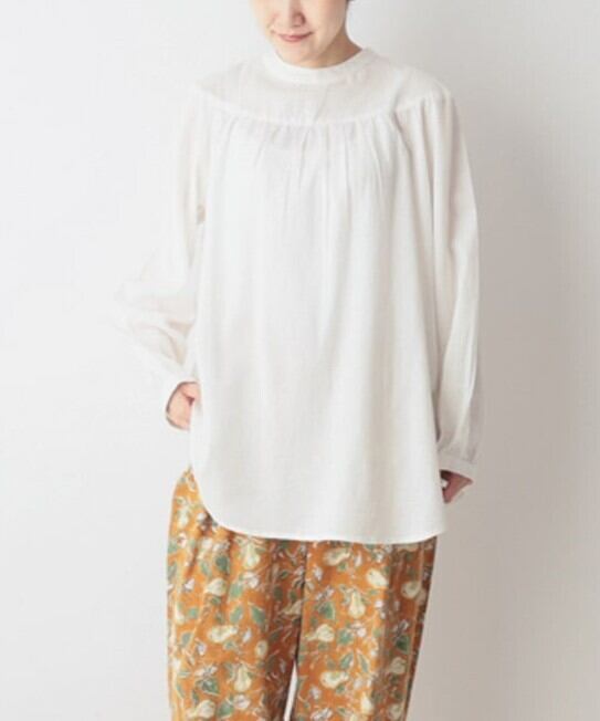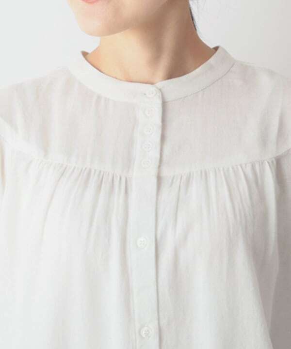 襟元の密についたボタンが程よいアクセントとなり、一枚で存在感のあるブラウスです。