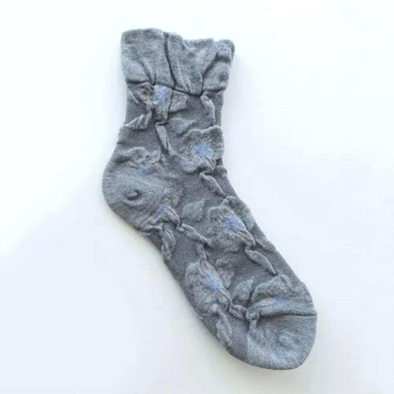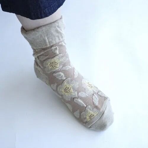 お花がフロート仕様に編まれたおしゃれな1足。全体的に統一感のある色合いにしたことで、落ち着いた印象に仕上げました。