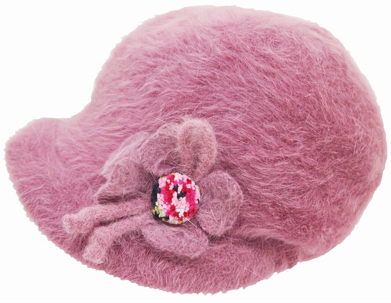 ふわふわ毛足の長いアンゴラ混の、毛糸で編んだつば付きニット帽です。