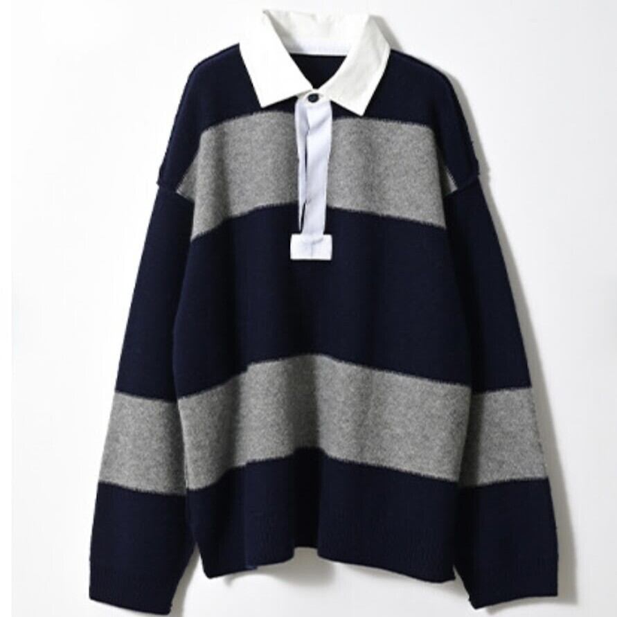襟はしっかりとした生地を縫い合わせて、前立て部分はグログランテープを比翼仕立てにし、細部までこだわり着るだけでワンランク上のこなれ感漂うラガーシャツニットに仕立てました。