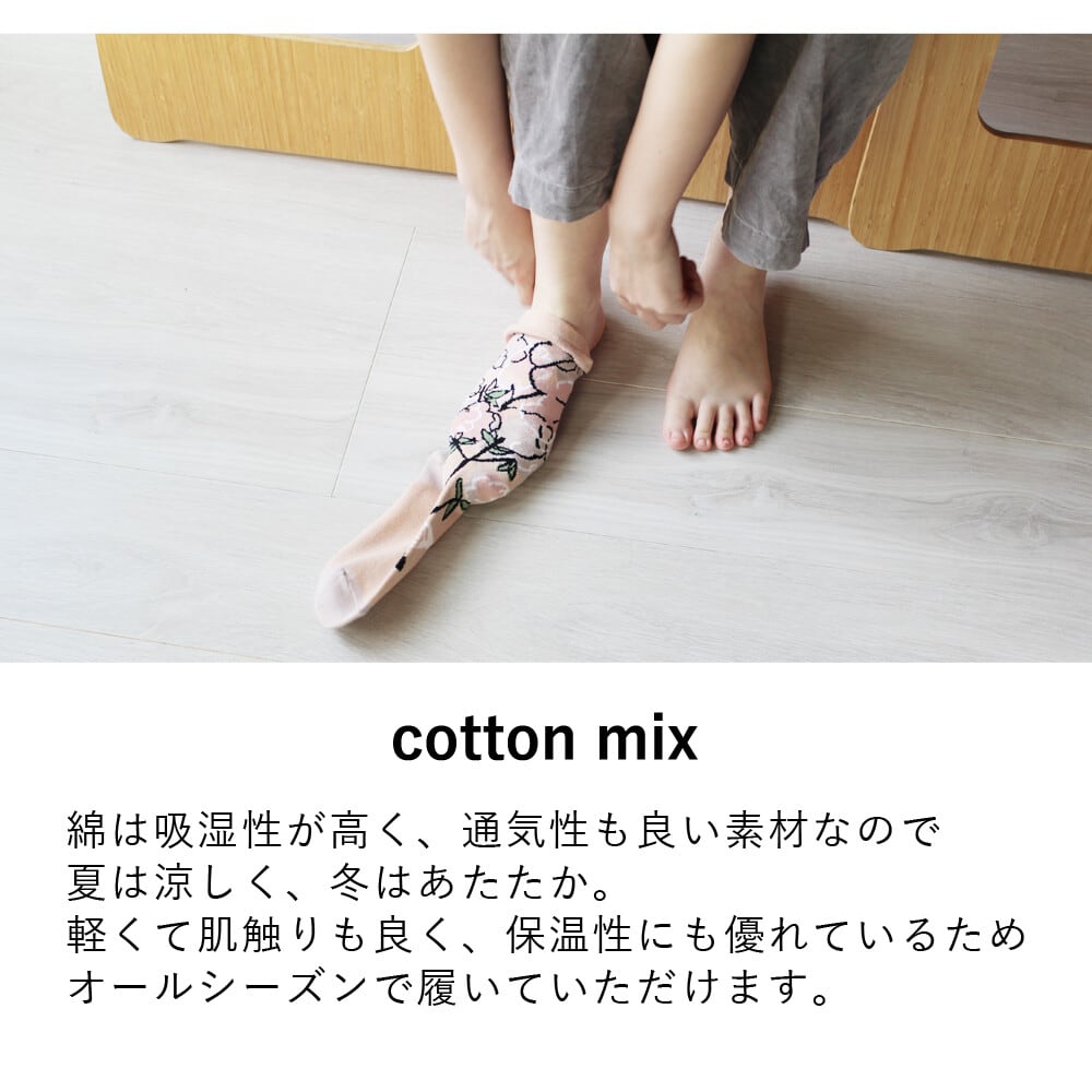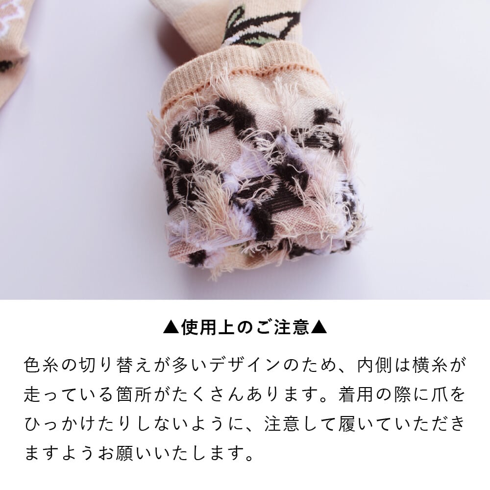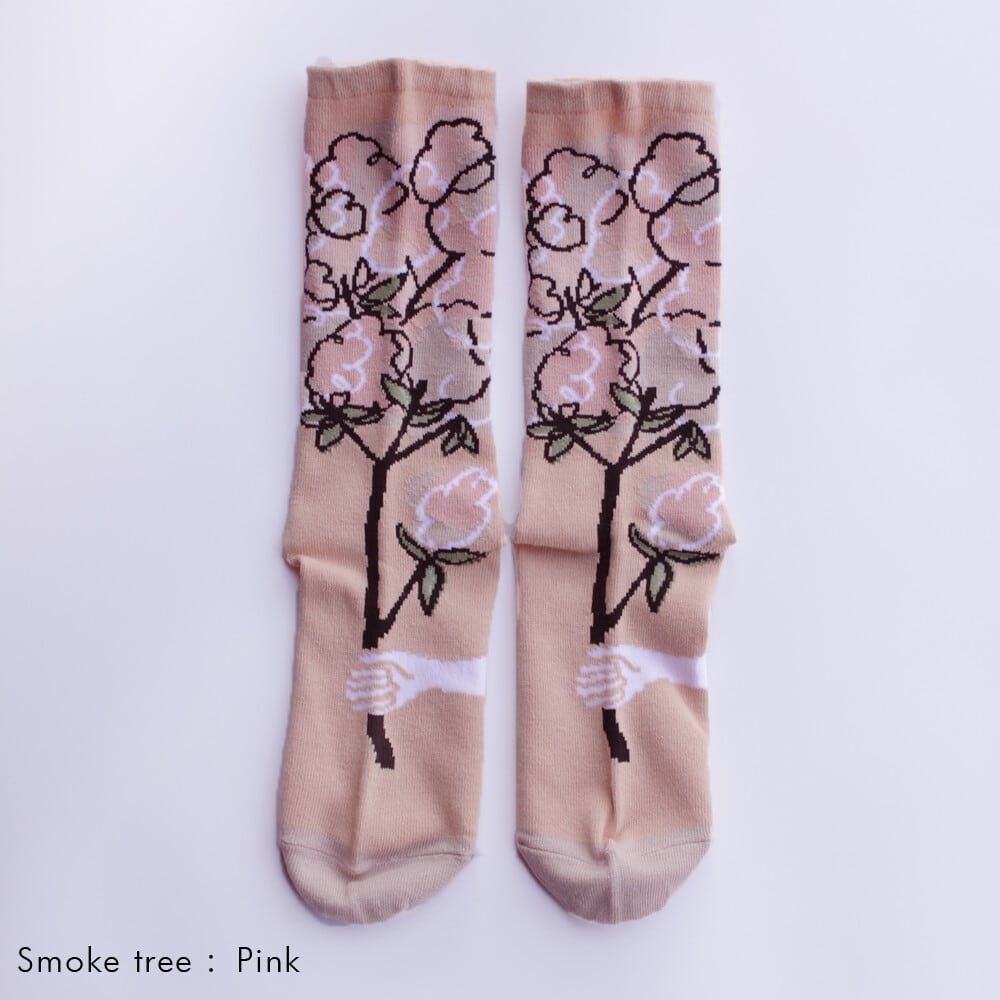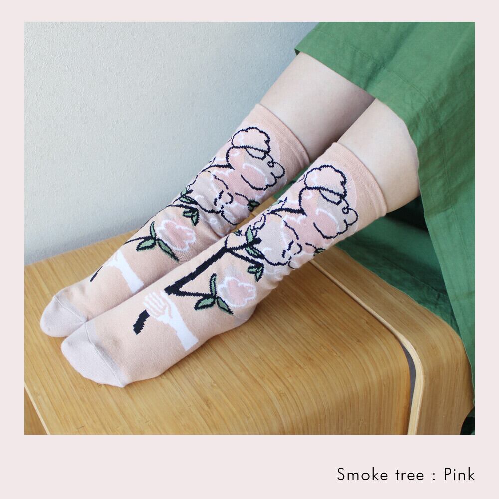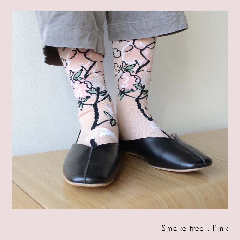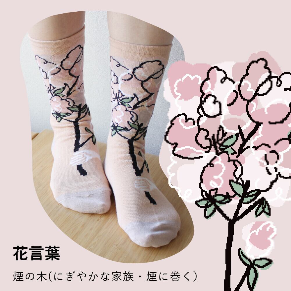 ひとつの枝の中でも奥行き感やふわっとした様子が繊細な線画や淡い色味で表現されていて、かわいい見ためをそのまま靴下に閉じ込めました。