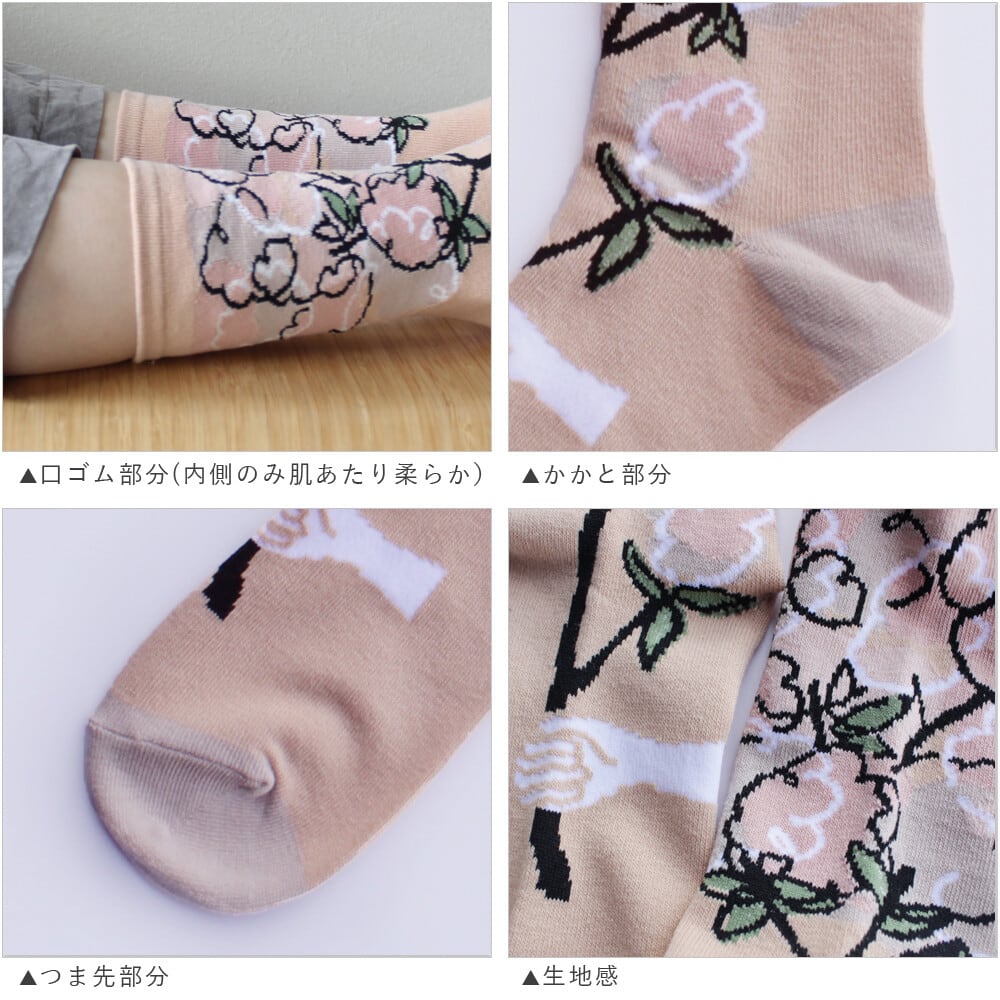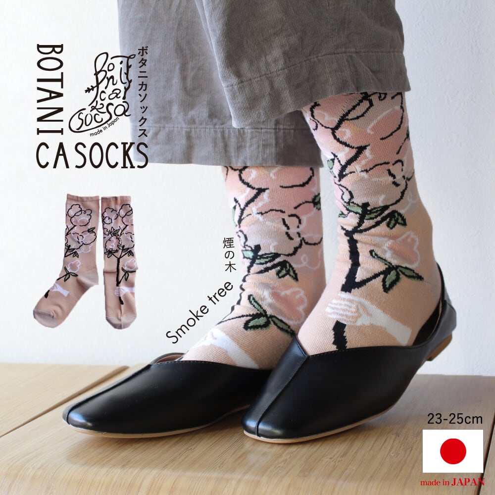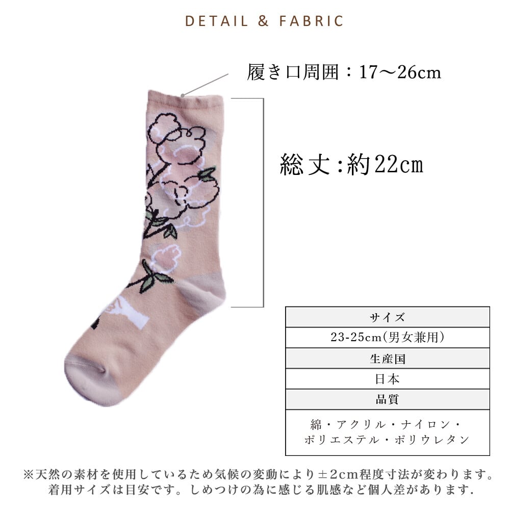 植物や花がいきいきと描かれ、日々の足元に彩りを添える靴下