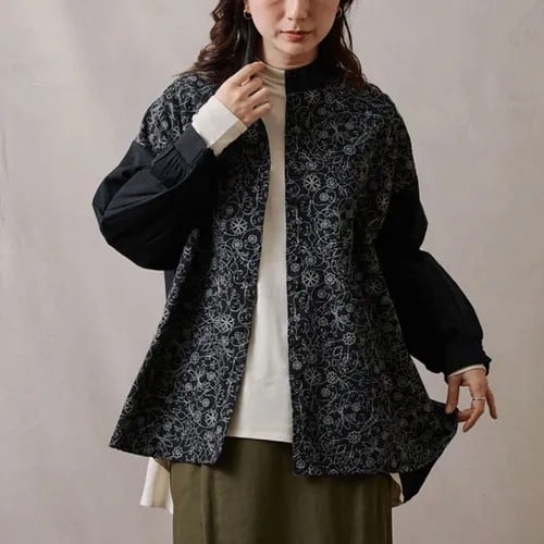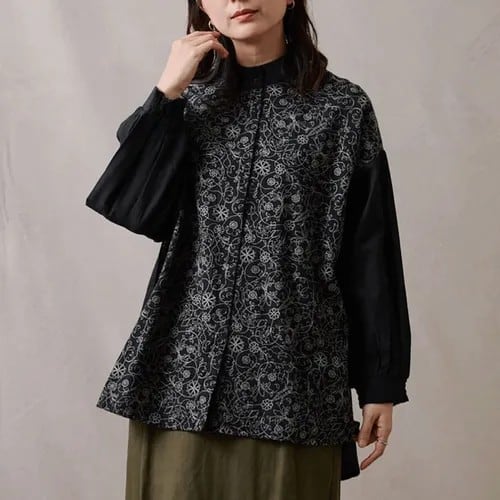 teMite テミテ 刺繍 ブラウス チュニック バンドカラー シャツ レディース 長袖 ノーカラー おしゃれ 50代 40代 綿 麻 秋 冬 春 黒 ブラック