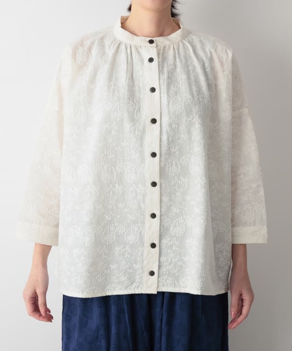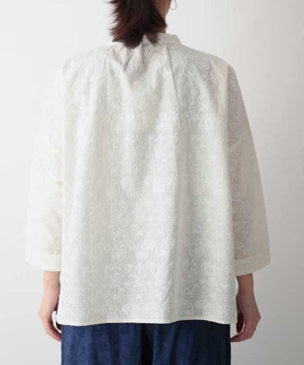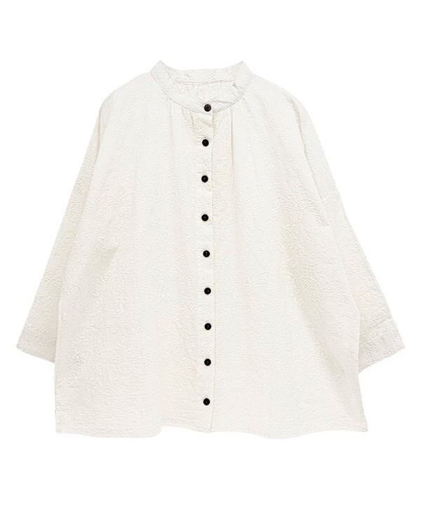 TANABANA 小花柄 ブラウス シャツ レディース 白 おしゃれ 40代 50代 60代 バンドカラー ノーカラー 7分袖 綿 コットン 刺繍 ペイズリー オフホワイト