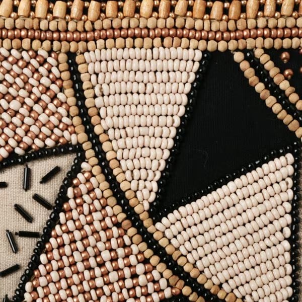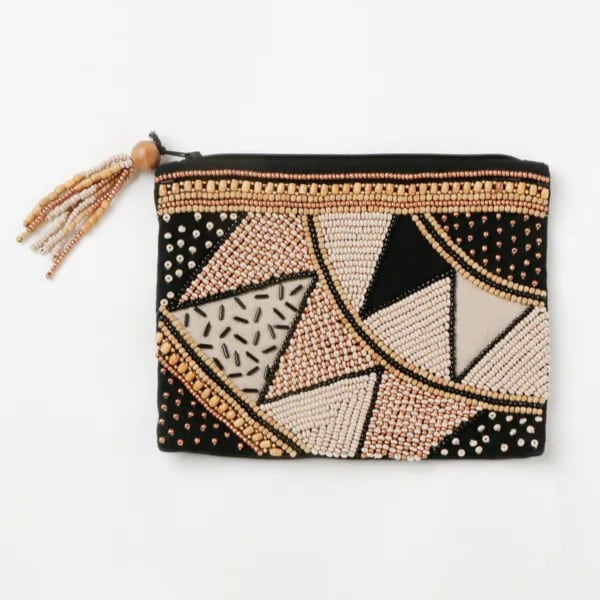 光沢のあるポリエステル生地に、幾何学模様のモチーフをビーズと機械刺繍で表現したポーチです。