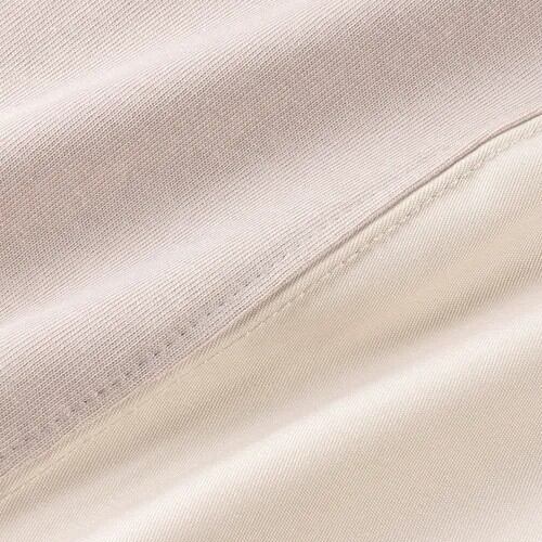 シンプルだけど異素材切り替えがアクセントになり、身体のラインを上手に隠してくれるドルマンシルエットが魅力。