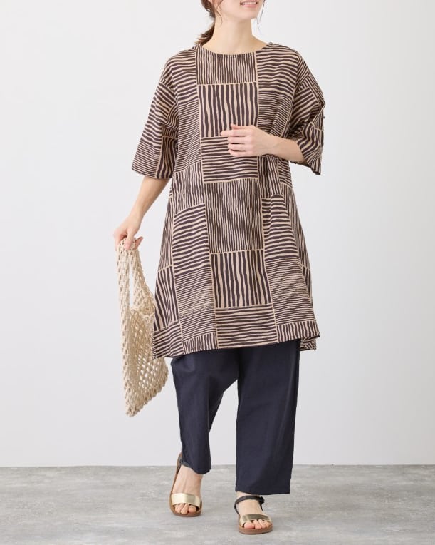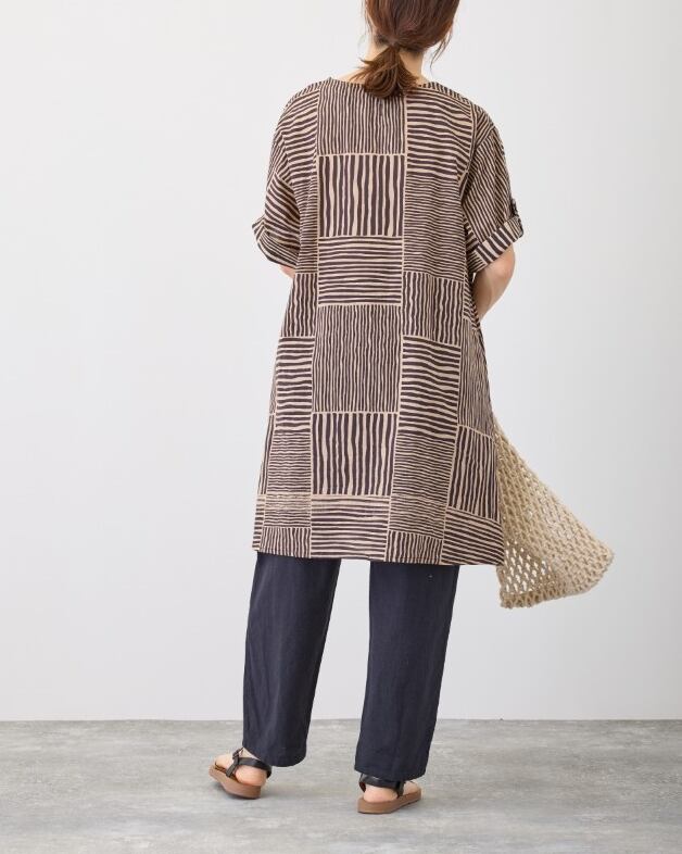 ランダムな太さを縦横に組み合わせた、ストライプ柄のチュニックワンピース。