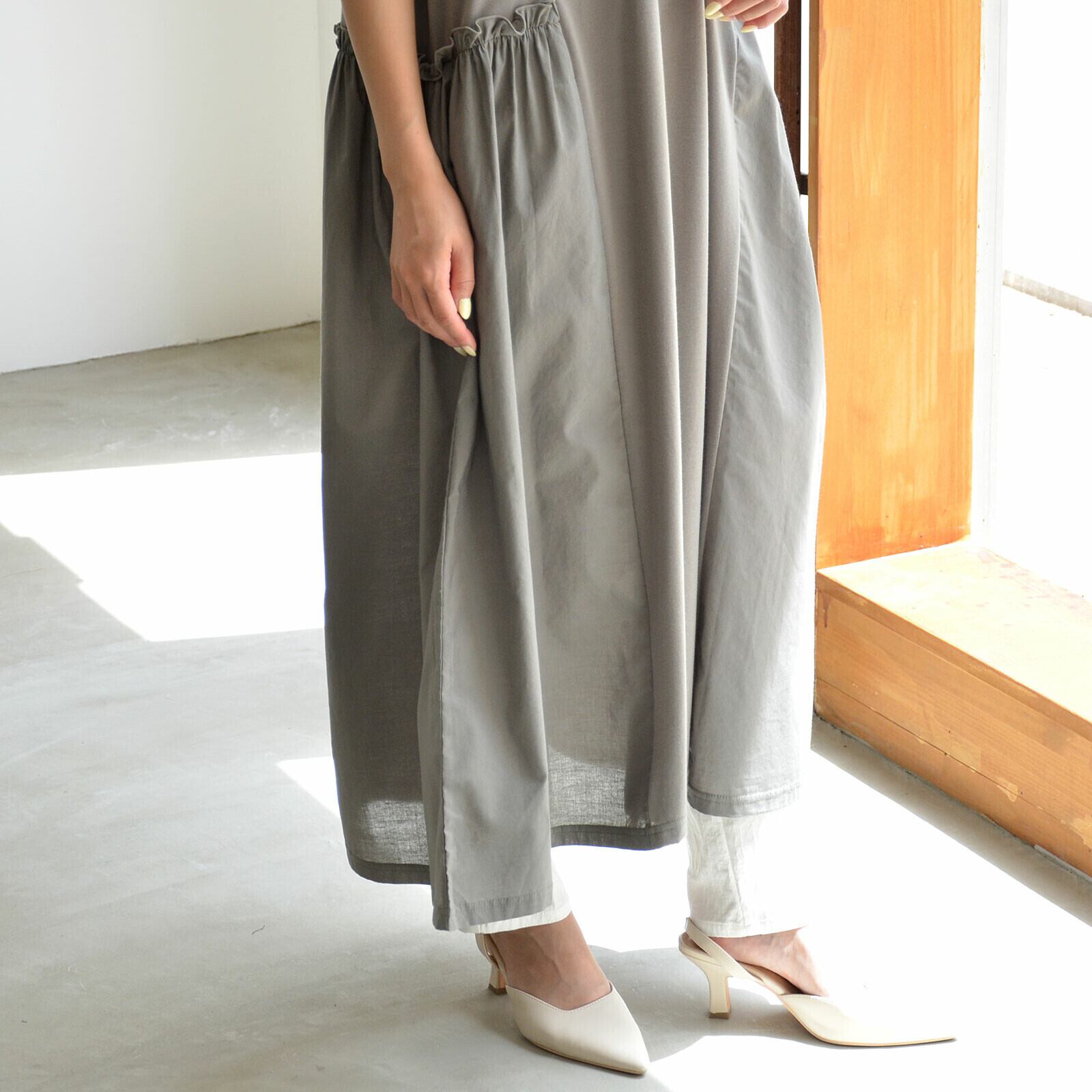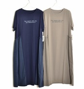 本体には伸縮性のあるカットソー生地を使い、脇を布帛の異素材で切替えたふんわりとしたデザインの半袖ワンピース。