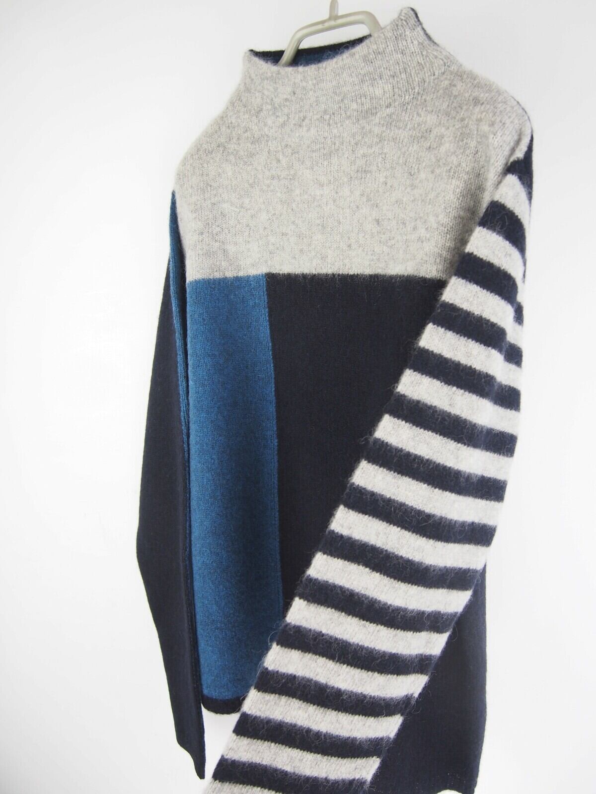 スムーズな立ち上がりのモックネック、前身・スリーブ・後身それぞれが異なるカラーでバランスよく組み合わさったアシンメトリーのインターシャパターン。